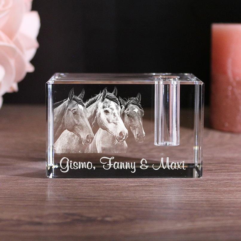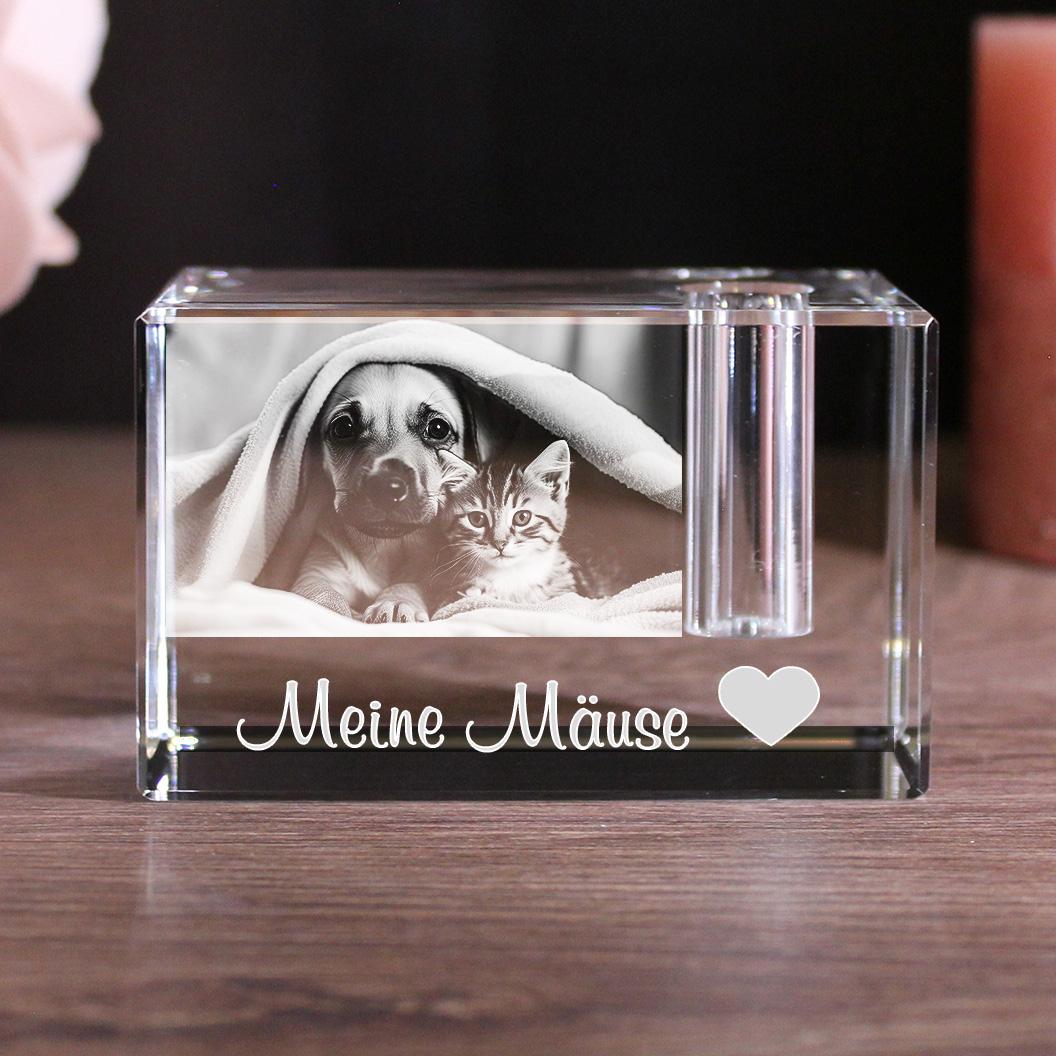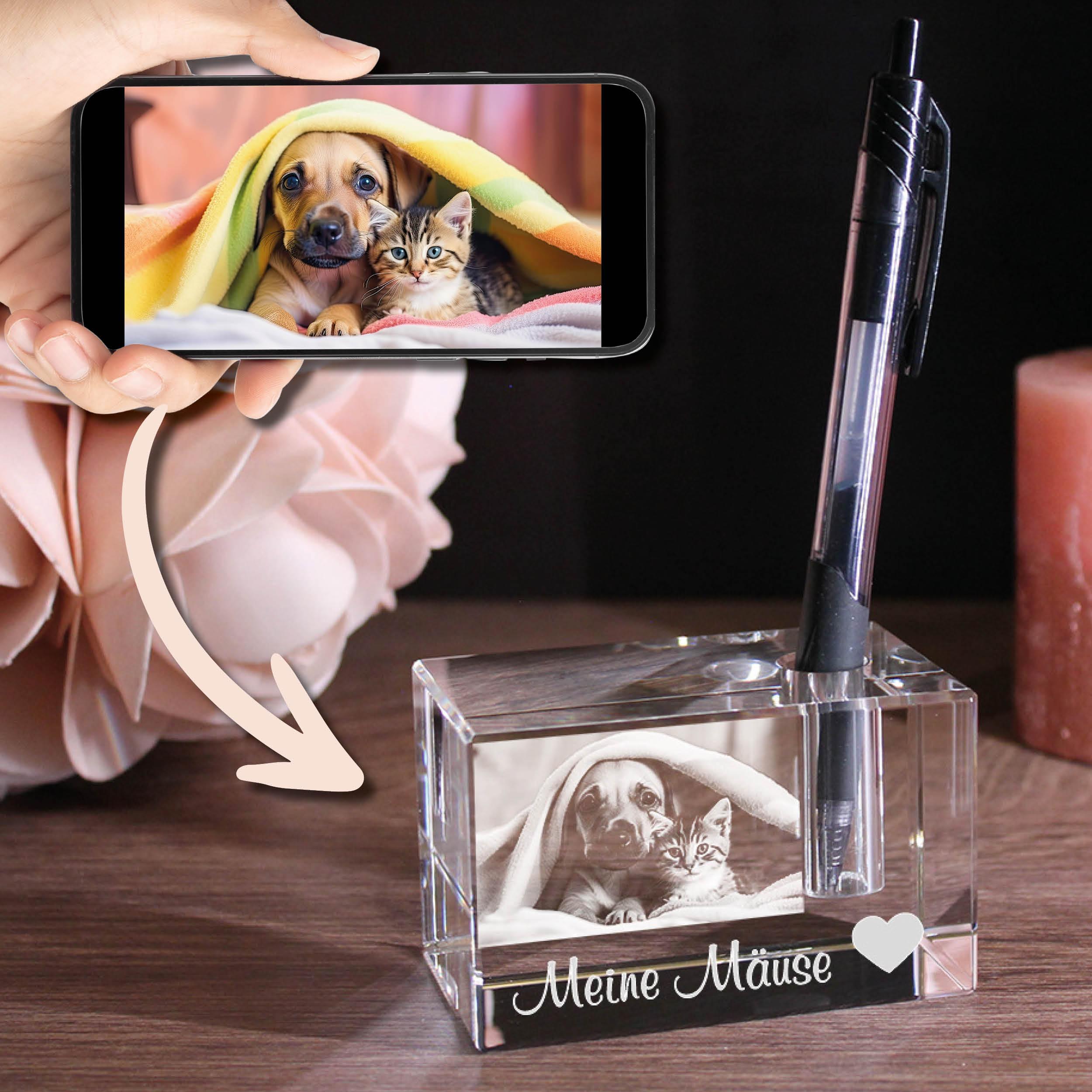 Mit diesem schönen Stifthalter kannst du einen ganz besonderen Moment mit deinem Haustier für die Ewigkeit festhalten. Wir gestalten für dich dein persönliches Dekoobjekt ganz nach deinen Wünschen. Du kannst dir aussuchen, ob wir dein Foto in 2D oder 3D gravieren sollen. Ebenfalls hast du die Wahl ob wir ein Foto mit nur einem Tier, mehreren Tieren oder ein Bild von dir gemeinsam mit deinem Tier nutzen. Deinen Lieblingsmoment können wir mit deinem Wunschtext ergänzen. Der Glaskristall mit Wunschfoto eignet sich auch perfekt als Geschenk zum Geburtstag, Weihnachten oder als kleine Aufmerksamkeit zwischendurch.
